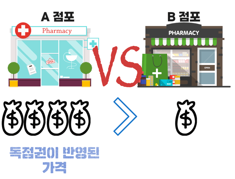 분양금액이 현저하게 차이나는 이유는 A 약국에 대해 독점영업권(프리미엄)이 보장되었기 때문일 가능성이 높기 때문입니다.