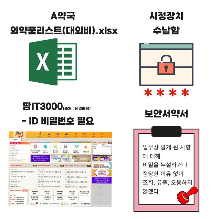 (1) 약품 리스트는 약국 PC에 'A약국 의약품 리스트(대외비)'라는 파일명으로 엑셀 파일 형태로 저장