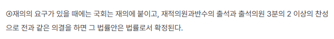 김건희 특검법에 대한 재의결을 같은 날로 정한 이유는 바로 정족수의 차이 때문입니다. 헌법 53조에 의하면, 대통령의 거부권 (재의요구)에 대한 재의결의 정족수는 재적의원 과반수의 출석과 출석의원 3분의 2 이상의 찬성이 필요합니다.