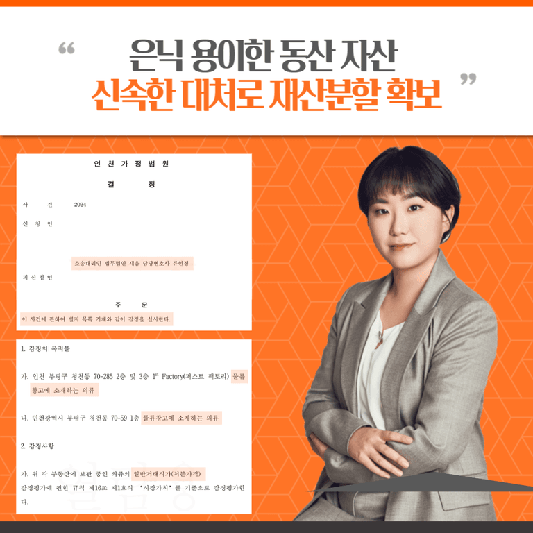 이처럼 재산분할 대상 중 은닉이 용이한 동산을 사건 초반에 신속하게 가치 산정하고 대처해, 의뢰인이 최대한의 재산분할을 확보 인정받을 수 있도록 이혼전문변호사의 능동적이고 적극적인 조력이 필요합니다.