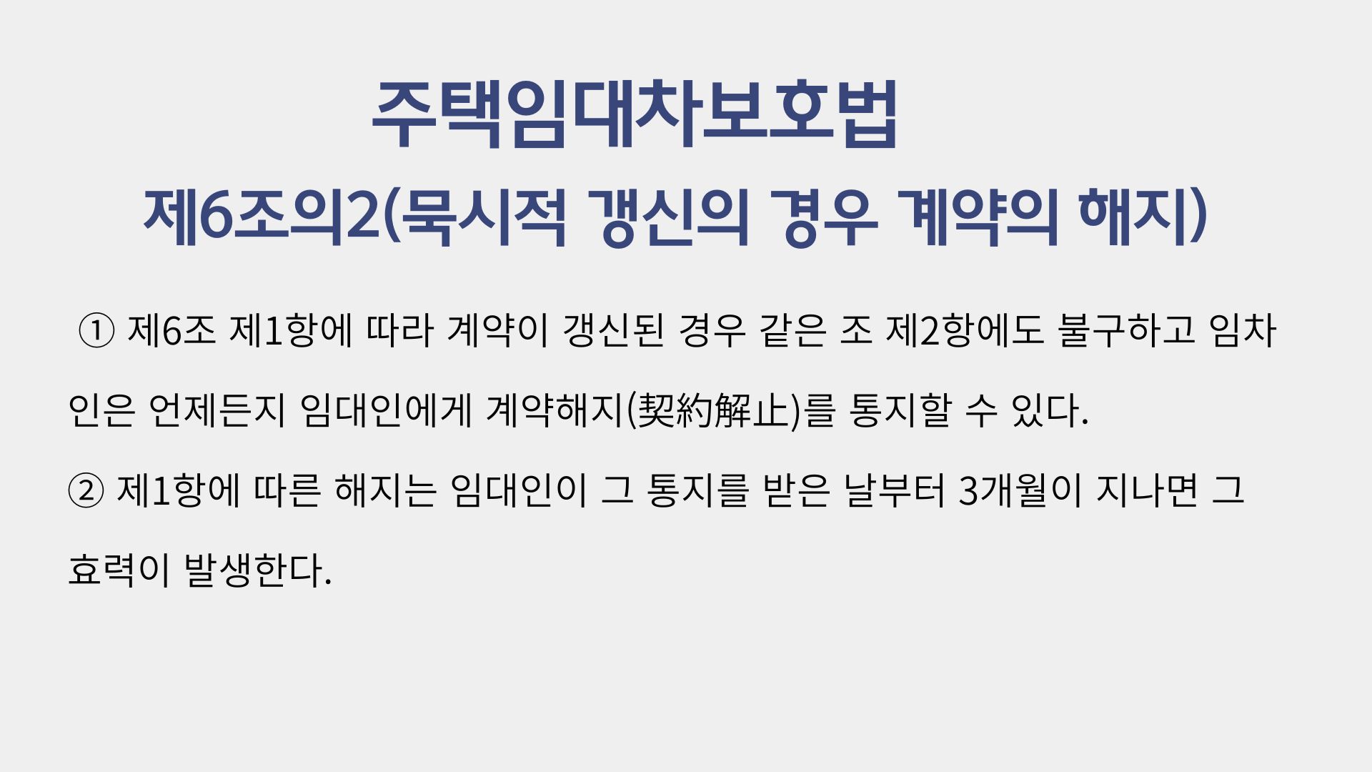중요한 점은, 임차인의 해지통지에 따른 임대차계약의 종료는 임대차계약이 ‘묵시적 갱신’된 경우에만 가능한 것이고, ‘합의에 의한 갱신’의 경우에는 가능하지 않다는 점입니다.
