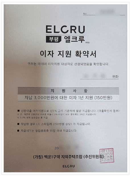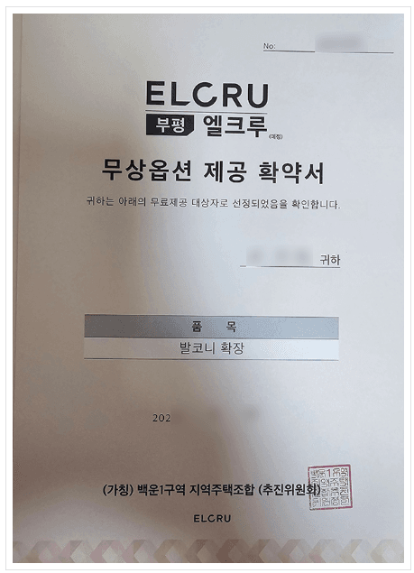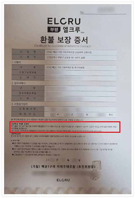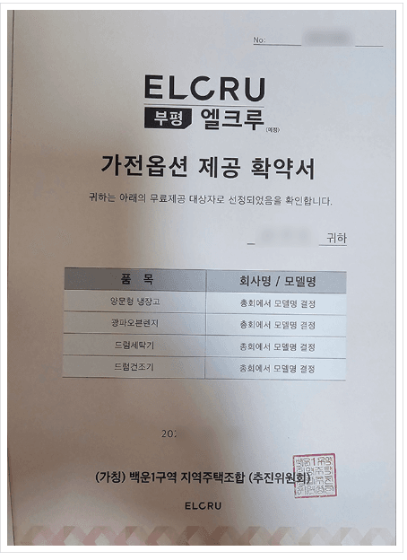 인천광역시 부평구 십정동 181-4번지 일원에서 <부평엘크루>라는 상호로 아파트를 건립하고자 만들어진 백운1구역 지역주택조합도 이러한 유형에 해당하는 지역주택조합 사업으로, 해당 사업장은 조합원들에게 환불보장증서(안심보장증서) 뿐만 아니라 발코니 확장 무상옵션 제공 확약서, 가전옵션 제공 확약서, 이자 지원 확약서 등의 각종 혜택을 약속하는 약정서를 교부하였습니다.