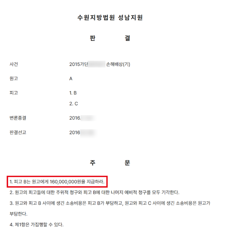 이에 수원지방법원은 원고가 이 사건 계약의 중요 부분이 된 동기에 관해 착오를 일으켜 이 사건 계약을 체결하였으므로, 피고는 계약 취소에 따른 원상회복으로 원고에게 권리금 1억 6천만원을 반환해야 한다는 승소판결을 선고했습니다.