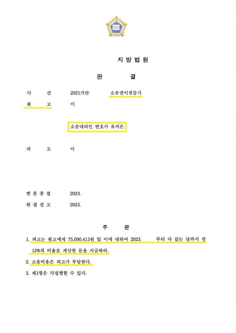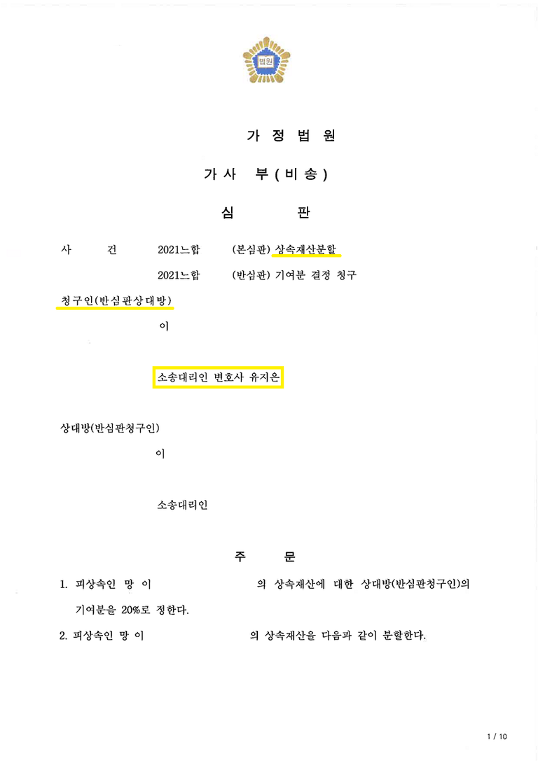 결국 의뢰인이 원하는 대로 부친의 상속재산분할건에서는 정산금으로 2억 2천만 원 상당액을 받아올 수 있었으며, 추가로 모친의 상속 관련하여 유류분 부족액으로 누나로부터 7,500만원을 성공적으로 받아올 수 있었습니다.