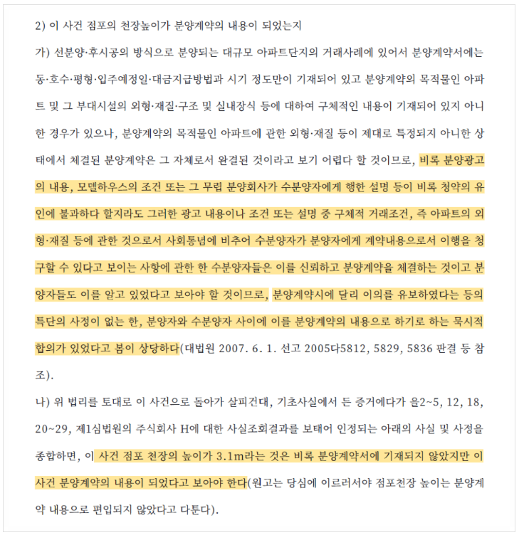 법원은 "비록 분양광고의 내용, 모델하우스의 조건 또는 그 무렵 분양회사가 수분양자에게 행한 설명 등이 비록 청약의 유인에 불과하다 할지라도 그러한 광고 내용이나 조건 또는 설명 중 구체적 거래조건, 즉 아파트의 외형·재질 등에 관한 것으로서 사회통념에 비추어 수분양자가 분양자에게 계약내용으로서 이행을 청구할 수 있다고 보이는 사항에 관한 한 수분양자들은 이를 신뢰하고 분양계약을 체결하는 것이고 분양자들도 이를 알고 있었다고 보아야 할 것이므로, 분양계약시에 달리 이의를 유보하였다는 등의 특단의 사정이 없는 한, 분양자와 수분양자 사이에 이를 분양계약의 내용으로 하기로 하는 묵시적 합의가 있었다고 봄이 상당하다(대법원 2007. 6. 1. 선고 2005다5812, 5829, 5836 판결 등)는 대법원의 판례를 인용하며, 이 사건 점포의 천장이 3.1m라는 것은 비록 분양계약서에 기재되어 있지는 않았지만 이 사건 분양계약의 내용이 되었다고 보아야 한다고 판단했습니다.