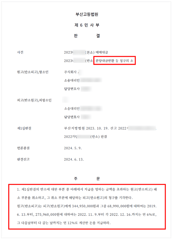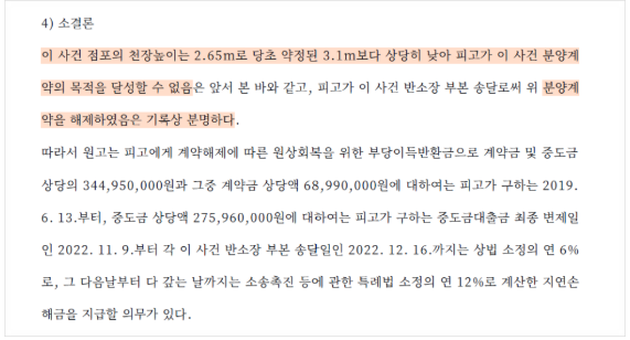 이에 이 사건의 천장높이로 인해 수분양자가 분양계약의 목적을 달성할 수 없다는 이유로, 부산고등법원은 분양계약을 취소하고, 시행사(피고)는 수분양자가 기납입한 계약금과 중도금 약 3억 4,500만원 및 지연손해금을 반환하라는 내용의 승소판결을 선고하였습니다.