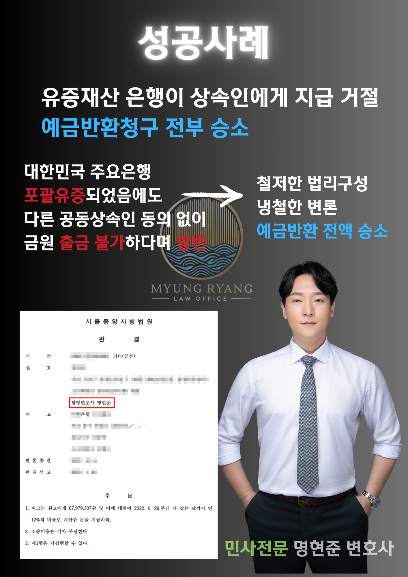 재판부는 본 변호인의 주장을 모두 받아들여 전부승소 판결을 선고하였습니다. 은행에서는 판결이 선고되자마자 모든 금원을 지급했죠.
