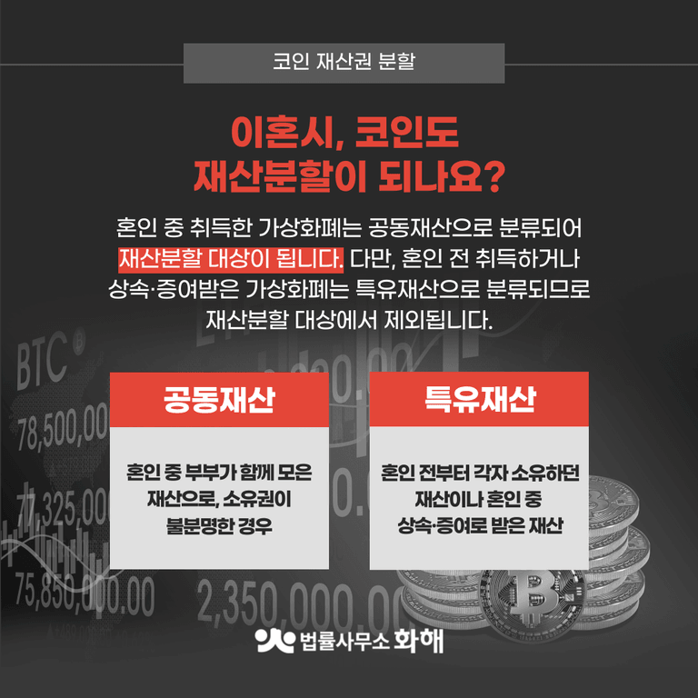 요즘 비트코인을 비롯한 가상화폐 투자 열풍이 불면서, 이혼 소송에서도 새로운 고민거리가 생겼습니다. 바로 '코인 재산권 분할'인데요. 혹시 여러분도 이런 고민을 해보신 적 있으신가요?