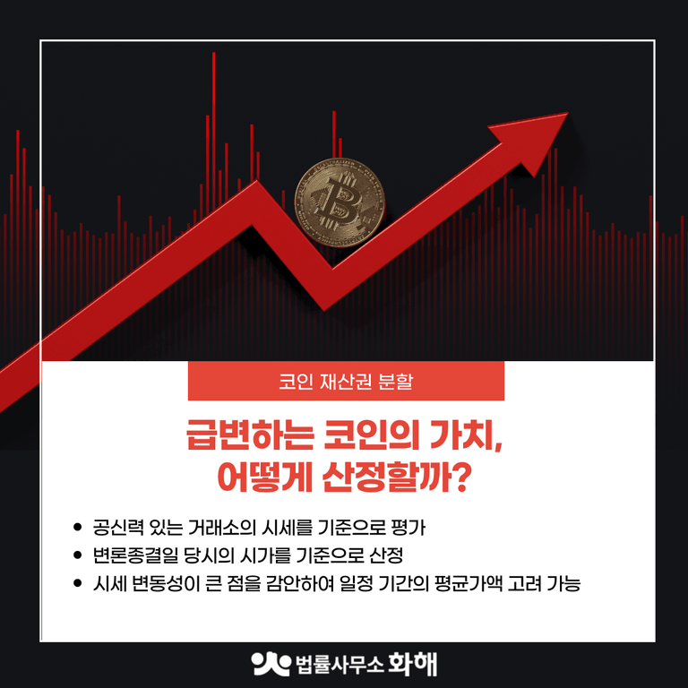 비트코인이나 이더리움 같은 가상화폐는 하루에도 가격이 크게 오르내리는데요. 24시간 거래가 가능하고 가격 변동폭이 큰 가상화폐의 가치를 어떻게 정할 것인가에 대한 부분도 고민거리입니다. 이런 변동성 때문에 법원에서는 공신력 있는 국내 대형 거래소들을 참고하여 일정 기간의 평균 가격을 기준으로 삼는 경향이 있습니다.