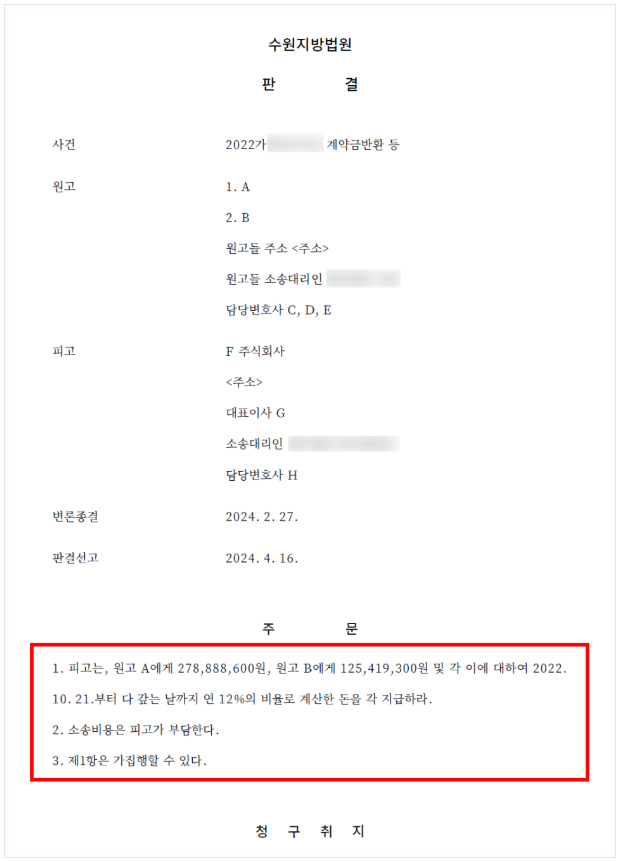 수원지방법원은 피고의 기망 또는 원고들의 착오를 원인으로 하여 분양계약을 취소시키고, 피고로 하여금 원고들에게 분양대금 및 이에 대한 지연손해금을 반환하라는 원고 승소판결을 선고하였습니다.