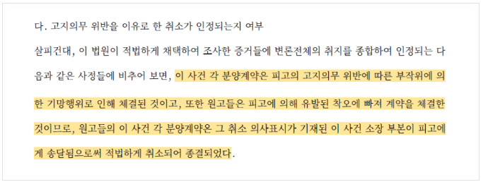 특히 이 사건 계약서 내에 "천장고/층고/레빌 등이 현장 여건에 따라 변경될 수 있다"라는 내용이 기재되어 있기는 하나, 계약의 체결 여부나 그 조건(분양대금) 등에 영향을 미칠 수 있는 내용에 대해서는 시행사가 고지의무를 취해야 한다고 지적하며, 이 사건의 천장 높이가 일반 분양자들이 기대하였던 것보다 현저하게 낮아진데다, 피고가 건축법상 '층고' 개념 및 실제 층고와의 차이가 발생할 수 있음에 대한 별다른 설명이나 고지 없이 <8.2m 층고>만을 강조하여 광고를 한 사실이 인정되므로,