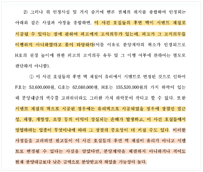 이에 대한 법원의 판단을 살펴보면, 법원은 이 사건 호실들의 후면 벽 재질이 유리에서 시멘트로 변경된 것은 유리벽일때의 장점인 접근성, 채광, 개방성, 조망 등의 이익이 상실되기 때문에, 만일 원고들이 이 사건 호실들의 후면 벽 재질이 유리가 아니고 시멘트로 변경될 수 있다는 사실을 알았다면, 분양계약을 체결하지 아니하거나 적어도 현재 분양대금보다 낮은 금액으로 분양받았을 가능성이 높다고 판시하였습니다.