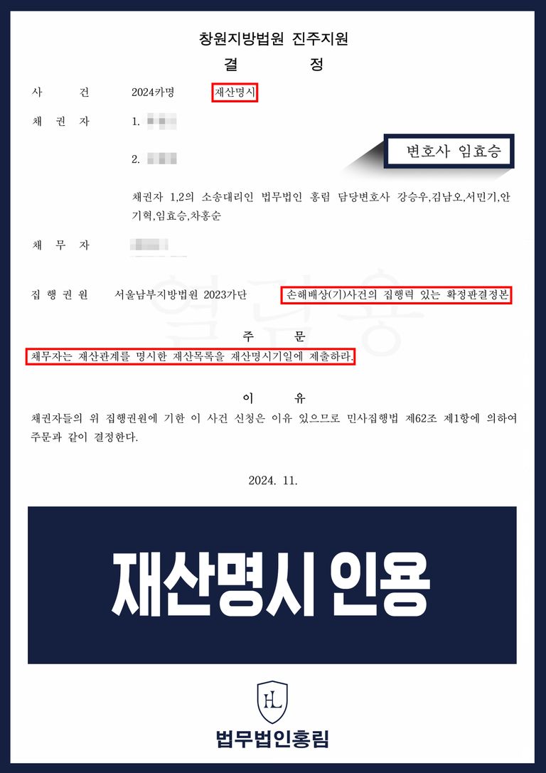 그 결과 법원에서는 변호인의 의견을 받아들여 채무자는 재산관계를 명시한 재산목록을 재산명시기일에 제출할 것을 판시하였습니다.