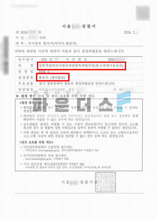 그 결과 의뢰인은 랜덤채팅 어플 내에서 헌터의 유도에 넘어가 성기사진을 전송한 통매음 사건에 있어 불송치 결정을 받아 경찰단계에서 사건을 마무리 지을 수 있었습니다.