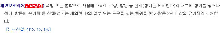 '유사강간죄'는 폭행 또는 협박으로 사람에 대하여 구강, 항문 등 신체(성기는 제외)의 내부에 성기를 넣거나 성기, 항문에 손가락 등 신체(성기는 제외)의 일부 또는 도구를 넣는 행위를 한 경우를 의미하고, '형법'은 이를 2년 이상의 유기징역에 처하도록 규정하고 있습니다.