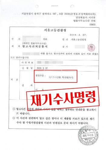 서울고등검찰청으로부터 혐의없음 처분을 파기하고 피의자의 사기죄에 대한 재기수사 명령을 내리게 되었습니다.