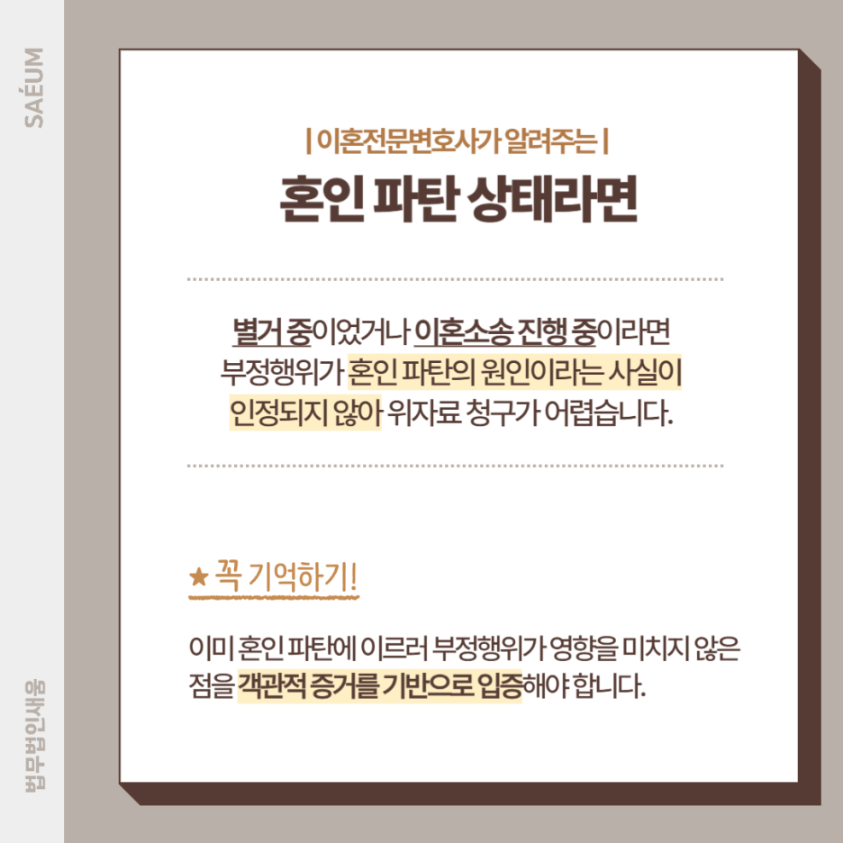 마지막으로는 혼인 관계가 파탄에 이르렀어야 합니다. 간혹 어떤 분들은 이미 배우자와 관계가 끝났지만, 이후에도 불륜을 저질렀다는 이유만으로도 상간 소장을 보내어 상간녀 위자료를 청구하고는 하는데요.