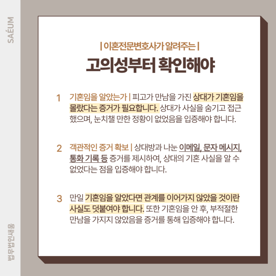 이때 반드시 입증해야 하는 것은 크게 세 가지입니다. 상대가 기혼임을 인지하였고, 부정행위가 일어났으며 혼인이 파탄에 이르렀다는 사실입니다.