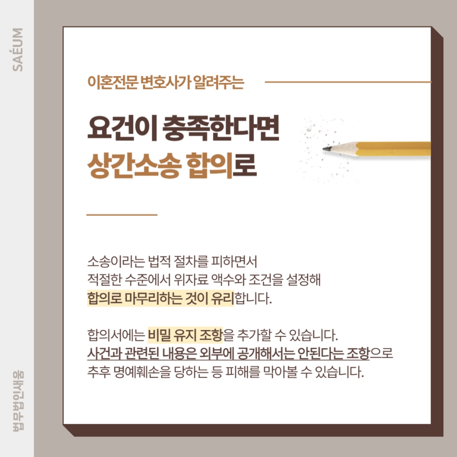 따라서 법적 절차를 피하면서 적절한 수준에서 상간녀 위자료의 액수와 조건을 설정해서 합의를 마무리하는 것이 유리합니다. 참고로 합의서에는 비밀 유지의 조항을 추가할 수 있는데요. 합의를 통해 마무리된다면 해당 내용을 결코 외부에 공개해서는 안 된다는 조항을 넣는 것이 가능합니다. 이를 통해 추가로 명예훼손을 당하는 등 피해를 당하는 일을 방지할 수 있습니다.