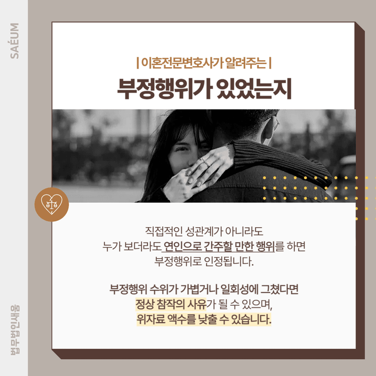 두 번째로는 실질적인 부정행위의 실체가 존재해야 합니다. 예전에 간통죄가 살아 있을 때는 직접 성관계를 하였다는 사실이 드러나야 인정되는 경우가 많았는데요.