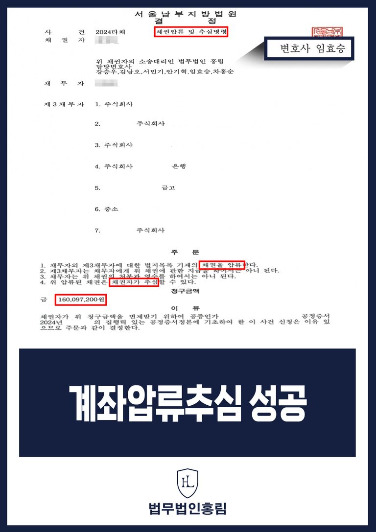 따라서 원고는 청구금액에 ① 피고의 제3채무자에 대한 별지목록 기재의 채권을 압류하고, ② 제3채무자는 피고에게 위 채권에 관한 지급을 하여서는 아니되고, ③ 피고는 위 채권의 처분과 영수를 하여서는 아니되며, ④ 위 압류 된 채권들은 채권자가 추심 할 수 있다는 주문을 받았습니다.