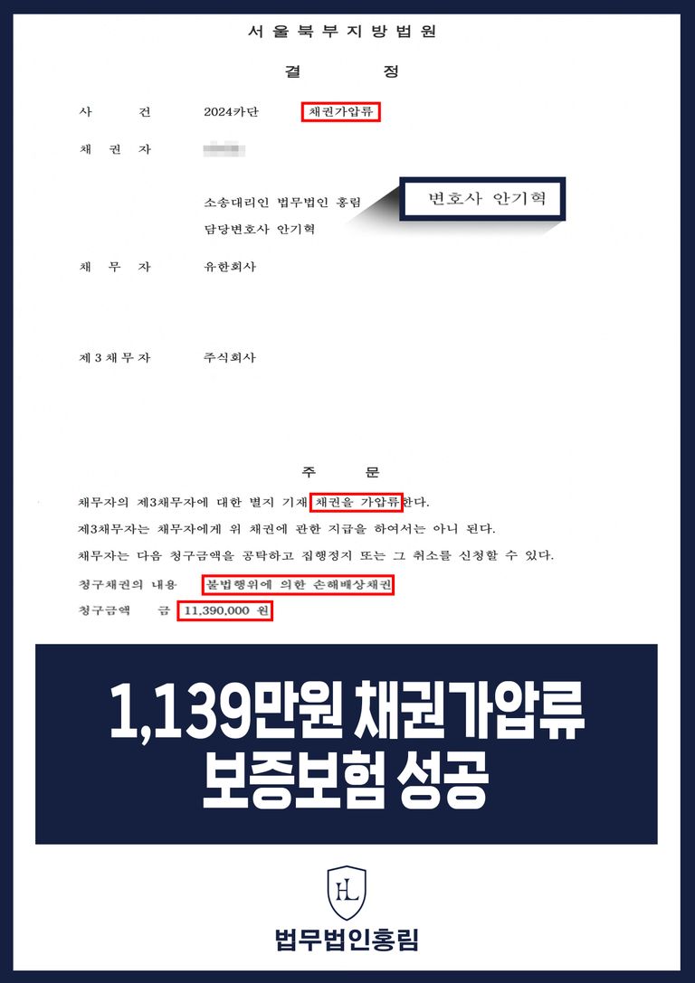 그 결과 법원에서는 본 변호인의 주장을 받아들여 통장 가압류(전액 보증보험)하였습니다.