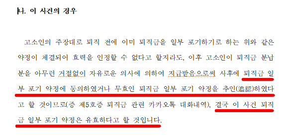 이 사건에서 B씨는 퇴직금 일부 포기 약정이 체결된 이후 이를 이행하지 않았다는 주장이 제기되었습니다. 그러나 수사기관에 제출된 카카오톡 대화 및 증빙 자료를 검토한 결과, 퇴직금 일부 포기 약정에 대해 B씨가 명확히 합의하였음을 확인할 수 있었습니다. 위의 의견에 따라 수사기관은 해당 합의가 유효하다고 판단하였으며, A씨가 본 약정에 따라 합의된 퇴직금 지급 과정이 잘 이루어지고 있다고 판단하였습니다.