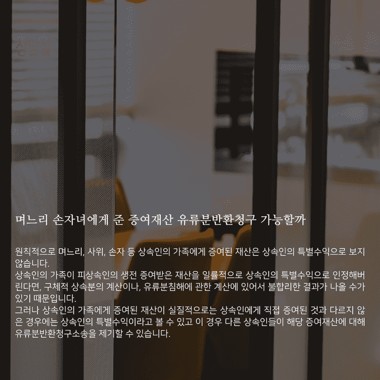 그런데 자식에게 직접 재산을 증여하지 않고 며느리(사위)나 손자녀에게 재산을 바로 증여한 경우, 형제들이 유류분반환을 청구할 수 있습니다.