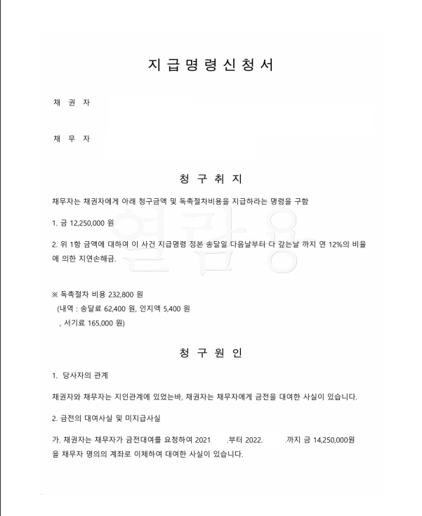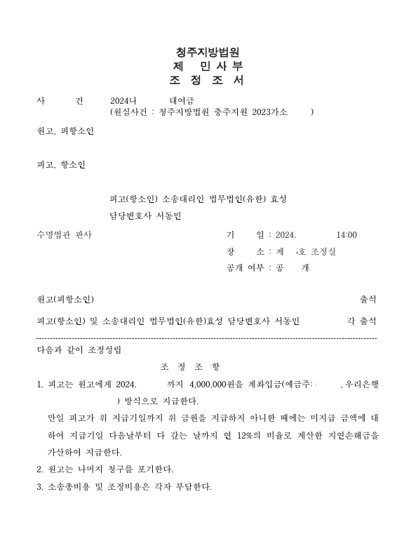 저는 즉각 응소하여 이 사건의 경위, 당사자 관계, 증여가 대다수이고 대여와 증여가 혼재되어 있음을 주장 입증하였고 법원은 의뢰인이 원고에게 최소 금액을 지급하는 내용의 조정을 하였습니다.
