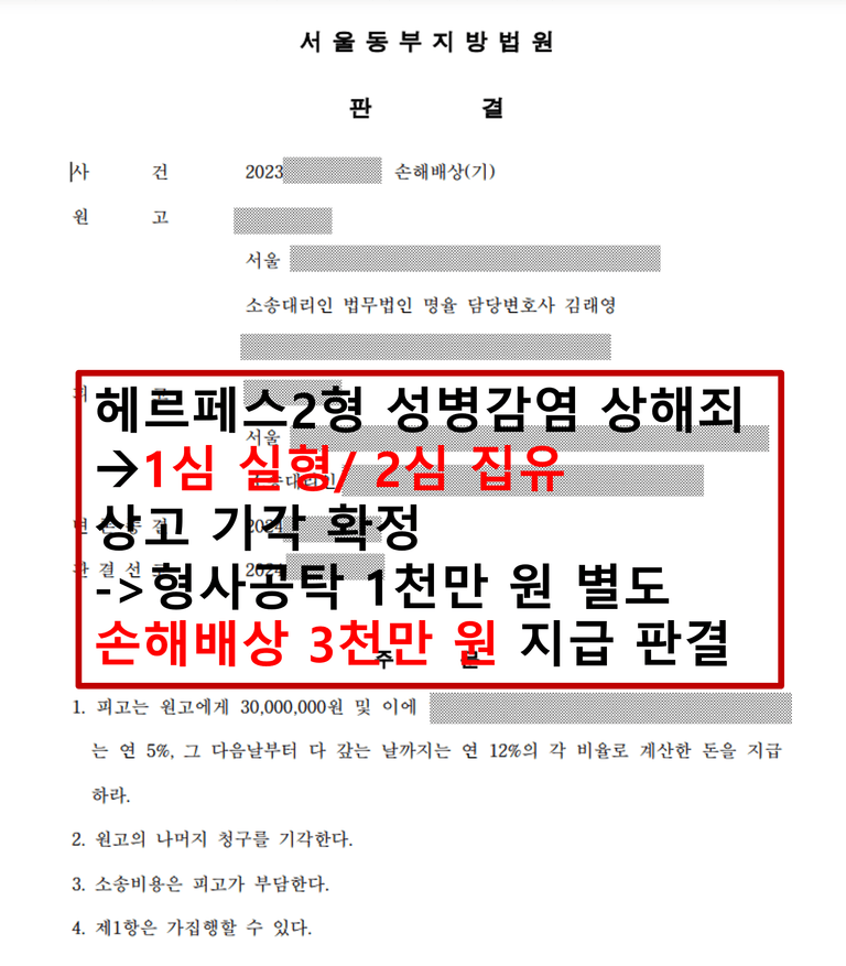 헤르페스2형 성병감염 상해죄로 형사 고소를 했을때 1심 실형/ 2심 집행유예/ 상고 기각 확정을 받았습니다.
