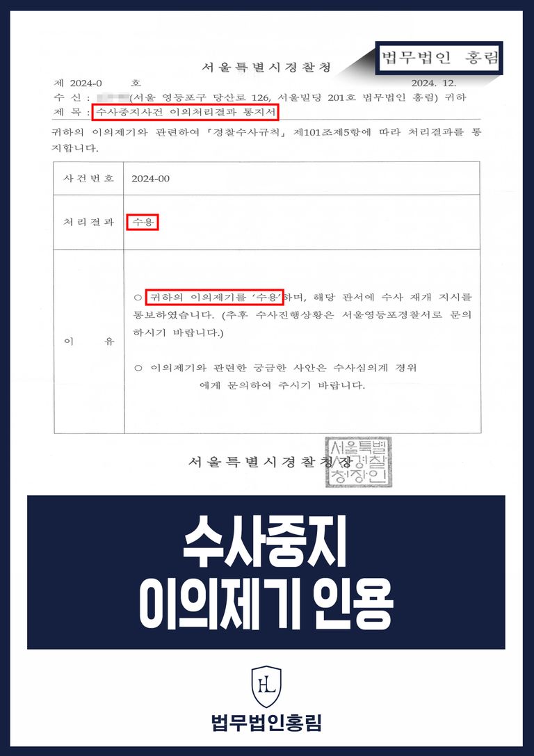 그 결과 경찰은 변호인의 의견을 받아들여 재수사 할 필요성이 있다고 보고 '이의제기 수용' 결정 하였습니다.