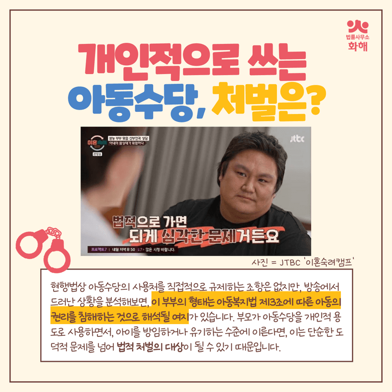 비록 현행법상 아동수당의 사용처를 직접적으로 규제하는 조항은 없지만, 방송에서 드러난 상황을 면밀히 분석해보면, 이 부부의 형태는 아동복지법 제3조에 따른 아동의 권리를 침해하는 것으로 해석될 여지가 있습니다. 부모가 아동수당을 개인적 용도로 사리사욕을 채우는데 사용하면서, 아이를 방임하거나 유기하는 수준에 이른다면, 이는 단순한 도덕적 문제를 넘어 법적 처벌의 대상이 될 수 있기 때문입니다.