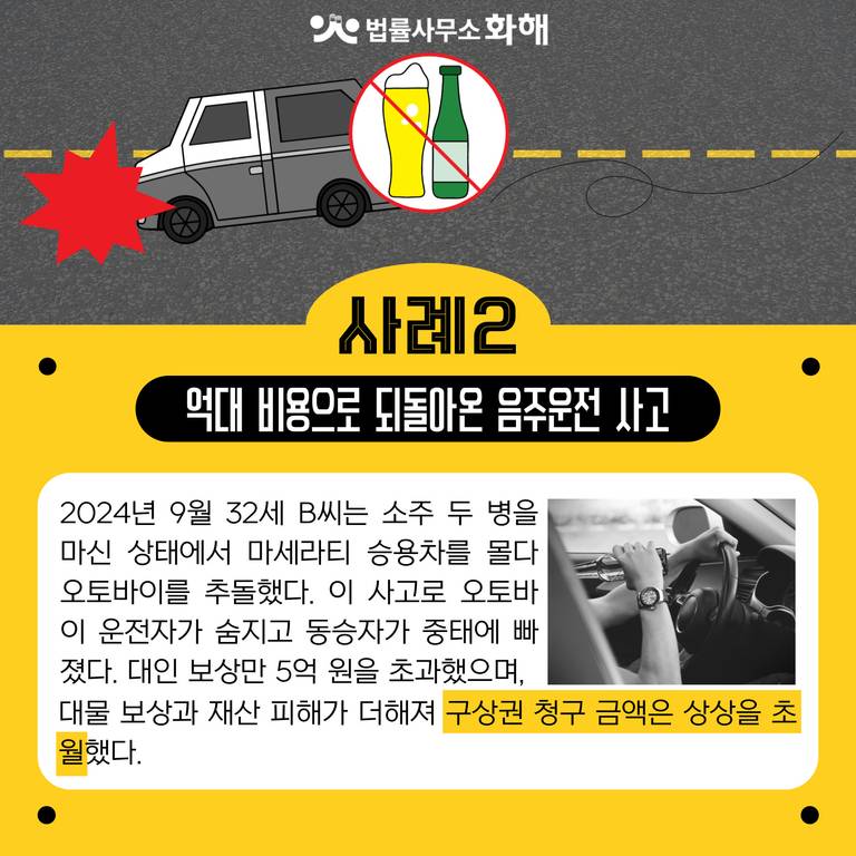 오늘은 법률사무소 화해에서 억대 음주운전 사고 사례와 처벌에 대해 자세히 알려드릴게요.