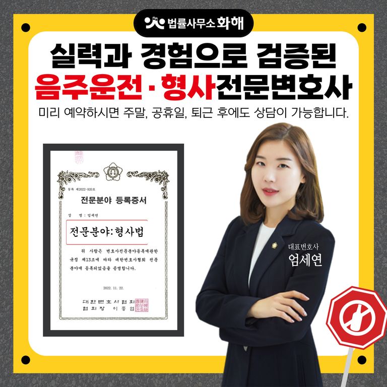 신속하고 철저한 대응이 이루어지지 않으면 형량이 증가하거나, 만약 수사가 이루어지고 뒤늦게 법률 대리인을 찾아오게 되면 상당히 복잡한 과정을 거쳐야 할 수도 있기에, 많아진 술 약속으로 음주운전의 위험 역시 높아지는 연말연시, 단속에 적발된 즉시 최대한 빠르게 법률사무소 화해 음주운전 전문 변호사의 법률조력을 받아보시는 것을 적극 권유해 드립니다.