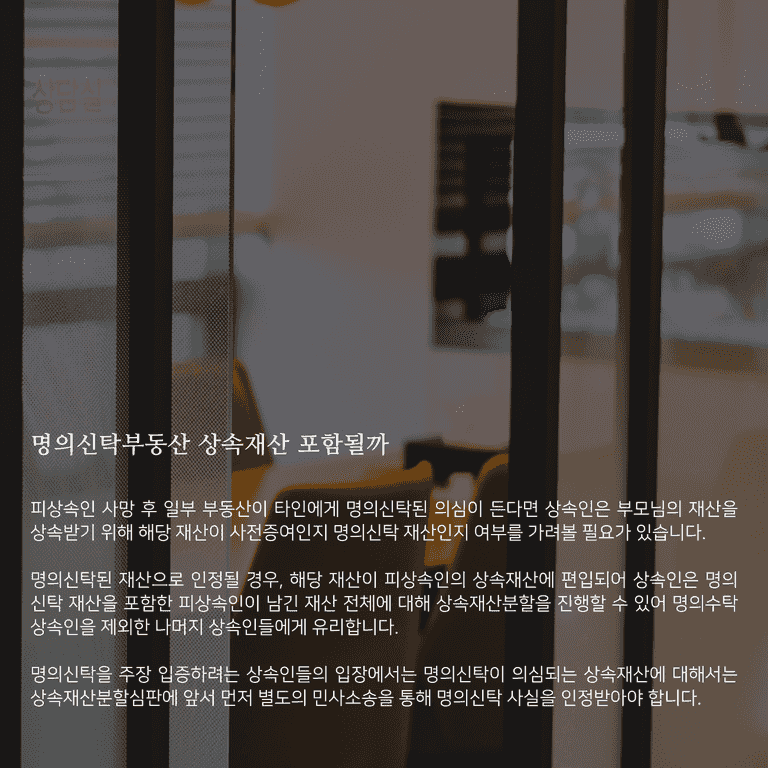 피상속인의 재산을 특정 상속인에게 명의신탁한 경우 피상속인 사망시 상속인간 명의신탁 재산에 대한 상속을 두고 분쟁이 발생할 수 있습니다.