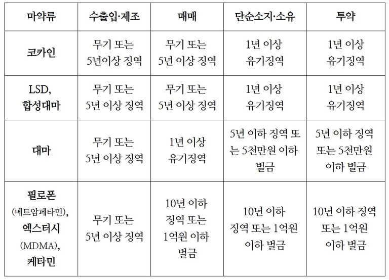 그리고 위 마약류는 그것을 수출입·제조·매매·소지·소유·투약 등 다양한 행위 태양에 따라 처벌의 기준 또한 차등 규정되어 있습니다.