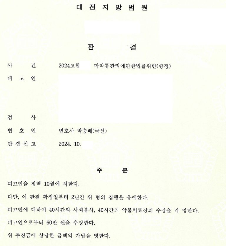 다만 투약 기간이 길지는 않았고 우연히 지인으로부터 받은 액상 대마를 흡입하게 된 안타까운 경위가 있었는데요. 특히 가족들과 장래를 같이하기로 약속한 사람이 있었기에 피고인의 선처를 간절히 탄원하고 있었습니다.