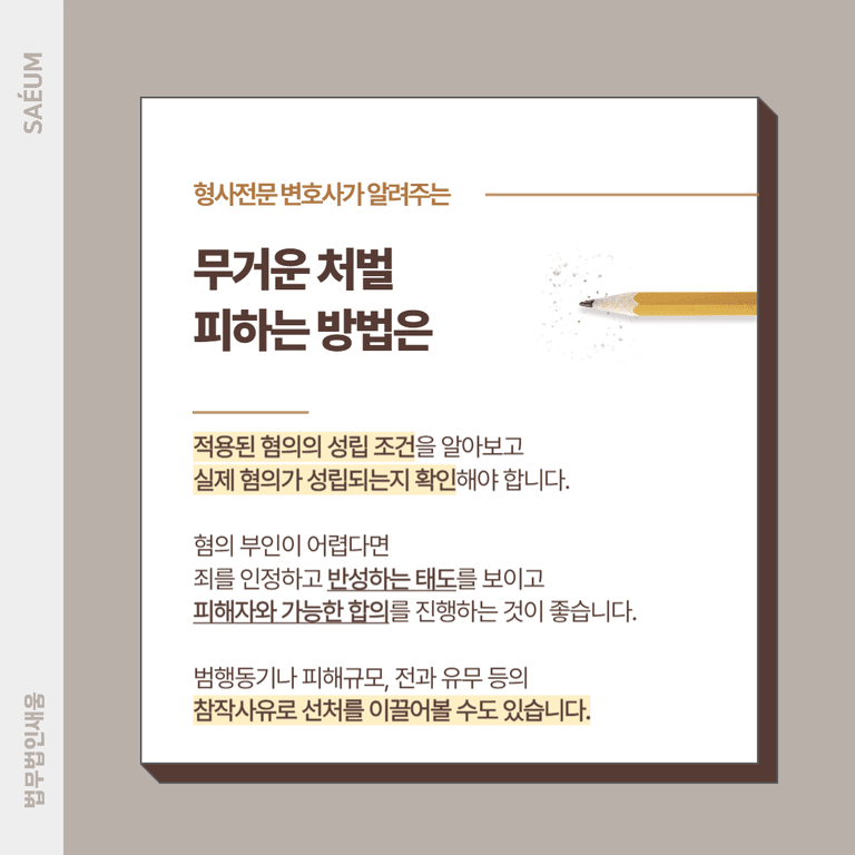 이후 객관적으로 살펴본 후 혐의 부인이 어렵다면 순순히 죄를 인정하고 반성하는 태도를 보이는 것이 좋으며, 피해자와 가능한 합의를 진행해 보는 것이 좋습니다. 이후 양형에 긍정적으로 영향을 줄 수 있는 요소들을 살펴봐야 합니다. 범행동기나, 범행으로 인한 피해 규모, 반성 및 전과의 유무, 주변 환경, 평소의 성행 등 다양한 것들을 기반으로 하여서 선처를 이끌어내 볼 수 있습니다.