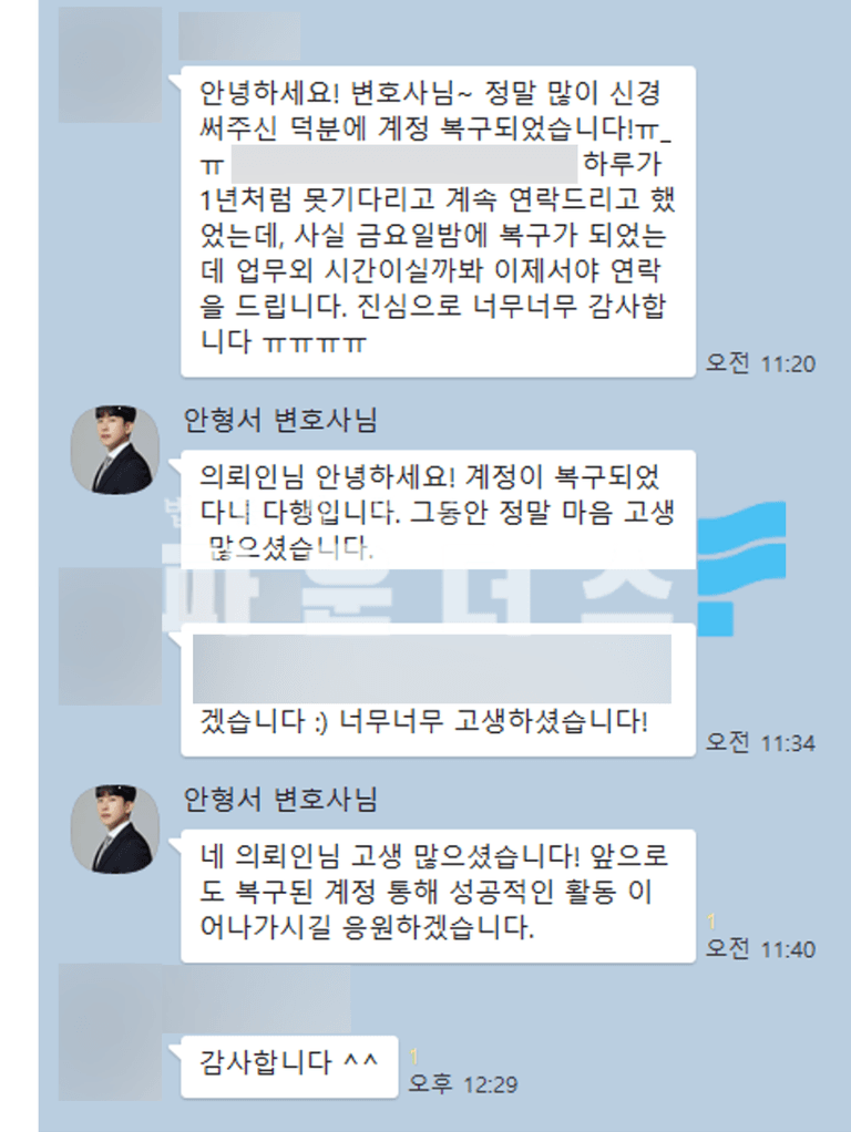 새로운 기술로 인해 발생하고 있는 피해지만 계정 복구가 늦어질 경우 그에 따라 발생할 수 있는 피해가 존재하기에 가급적 변호인의 조력을 통해 내용증명 발송으로 복구 당위성 주장 및 검토를 요청해 나가는 것이 바람직합니다.