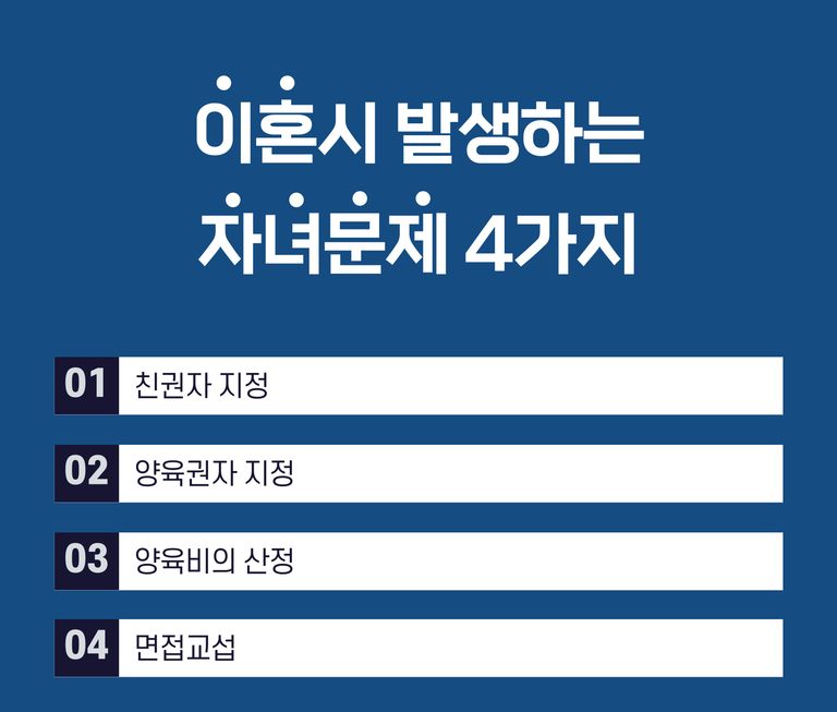 이혼절차를 밟을 때 미성년 자녀에 대해 발생하는 문제는 크게 4가지로 구분됩니다.