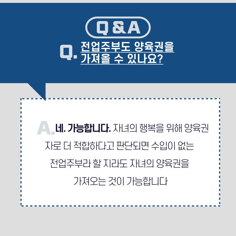 지금 당장 본인 명의로 된 수입이 없다 하더라도 이혼 후 재산분할을 통해 경제적 문제를 해결할 수도 있고, 비양육권자가 양육권자에게 양육비를 지급해야하는 의무도 있습니다.