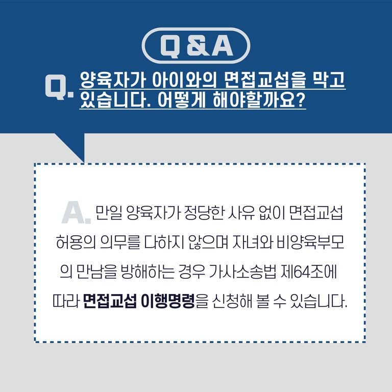 만일 정당한 사유 없이 면접교섭허용의 의무를 다하지 않으며 자녀와 비양육부모의 만남을 방해하는 경우 가사소송법 제64조에 따라 면접교섭 이행명령을 신청해 볼 수 있습니다.