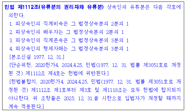 헌법재판소의 위헌 및 헌법불합치 결정에 따라(2020헌가4 등) 2025. 12. 31.을 마지막으로 현행 민법상 유류분에 대한 규정이 사라집니다.