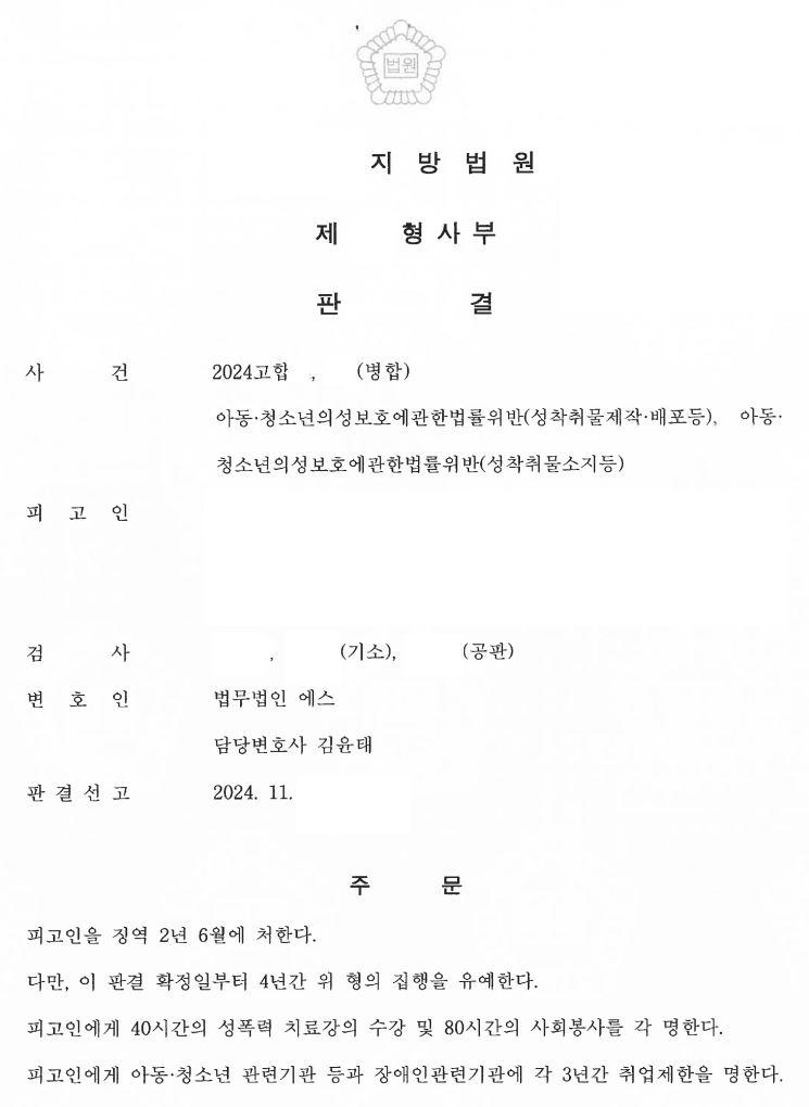6. A씨는 아청물 제작, 아청물 소지 2개의 사건으로 저희 법무법인 에스의 조력을 받아 1심에서 징역2년6개월, 집행유예 4년을 받을 수 있었습니다.