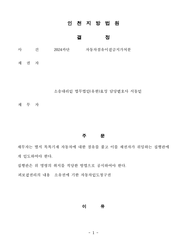 저는 즉각 자동차인도청구소송 및 자동차점유이전금지가처분을 제기하였고 가처분 인용 결정 후 신속하게 자동차를 회수하였습니다.