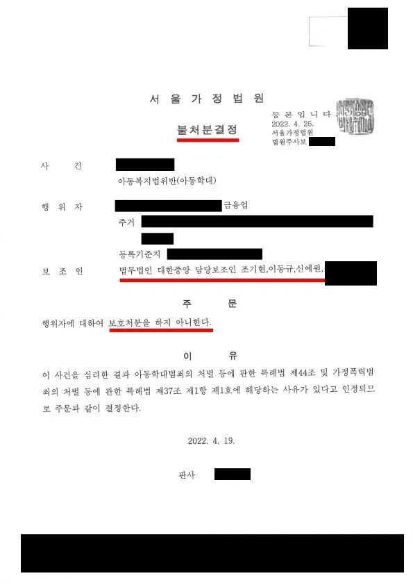 재판부는 이동규 변호사의 주장을 받아들여 친부에게 불처분결정을 내렸습니다.