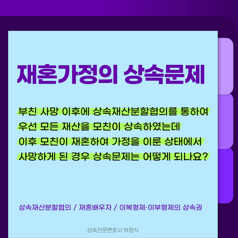 오늘은 부모님들 중 부친이 사망한 이후 가족들이 협의하여 부친의 상속재산을 우선 모친 명의로 상속처리를 하였는데, 모친이 다른 남성분과 재혼하여 생활하다가 사망하게 되어 그러한 모친 명의로 해두었던 부친의 상속재산에 대한 상속문제에 대해서 살펴보도록 하겠습니다.