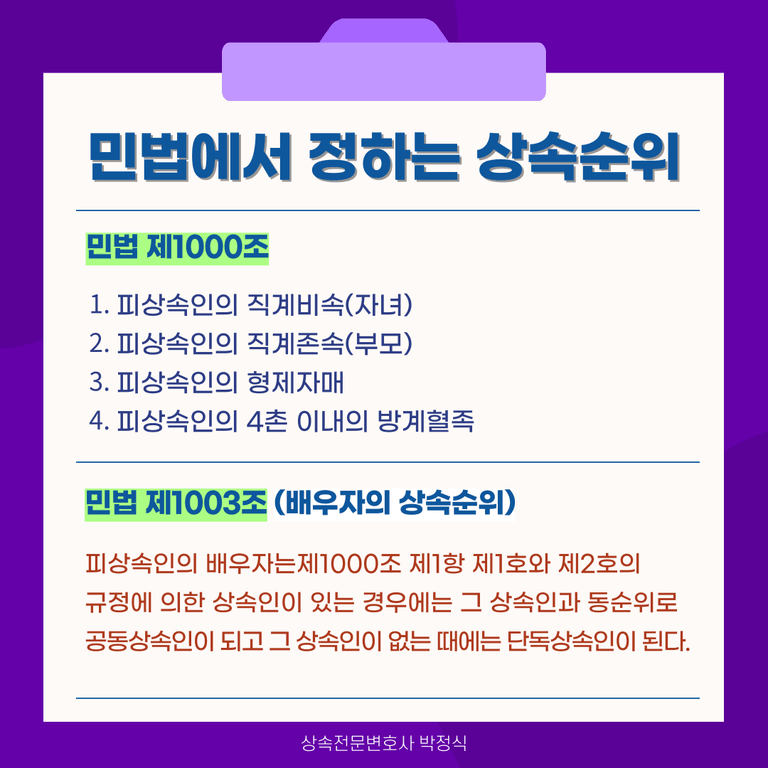 현행 민법 제1000조에서는 아래와 같이 "상속의 순위"를 구체적으로 규정하고 있습니다.