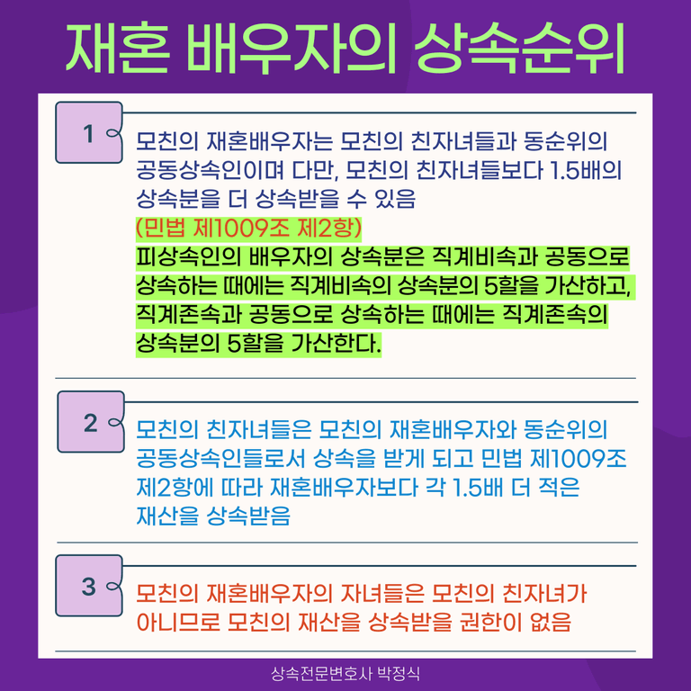 다만 모친이 재혼을 하였으므로 재혼배우자도 모친의 재산을 상속할 권한이 있는데 민법에서는 배우자의 상속순위에 대해서 아래와 같이 직계비속과 동순위의 공동상속인이 된다고 규정하고 있습니다