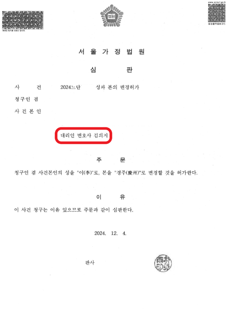 이번 사례는 20세 여성이 친모의 성본으로 변경을 신청한 건입니다. 청구인은 부모가 이혼한 후 12년간 외가에서 성장했습니다. 친부는 이혼 후 양육비를 전혀 부담하지 않았고, 자녀와의 교류도 단절된 상태였습니다. 반면 친모와 외가는 청구인의 교육과 양육을 전적으로 책임져왔으며, 대학 진학 후에도 등록금과 생활비를 지원하고 있었습니다.